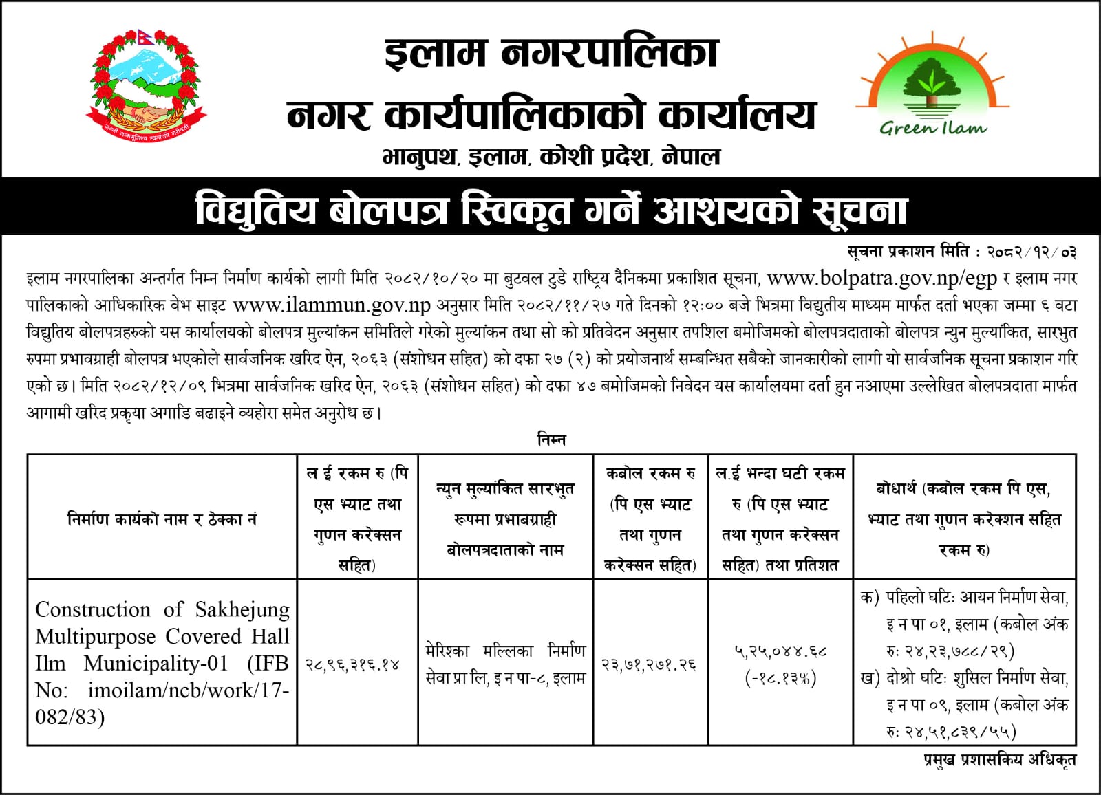 विद्युतिय बोलपत्र स्वीकृत गर्ने आशय सम्बन्धमा ।