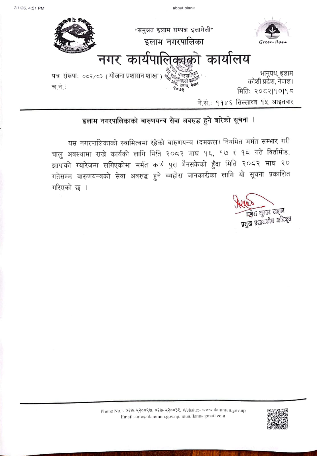 Home » इलाम नगरपालिकाको वारुणयन्त्र सेवा अवरुद्ध हुने बारेको सूचना ।