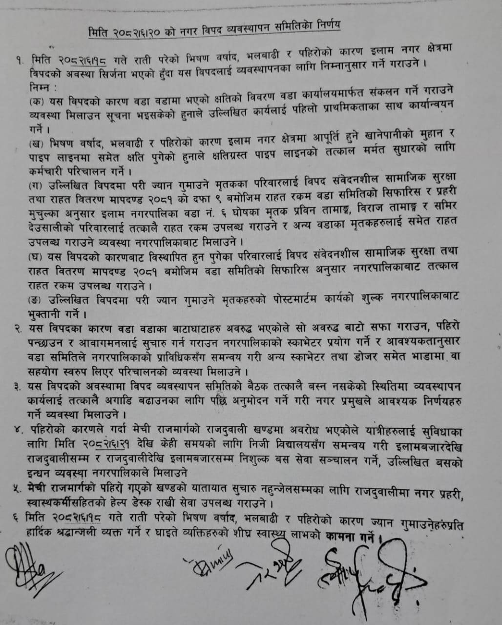 मिति २०८२।०६।२० को नगर विपद व्यवस्थापन समितिको निर्णय