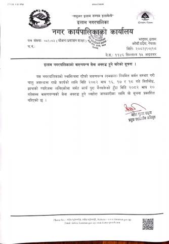Home » इलाम नगरपालिकाको वारुणयन्त्र सेवा अवरुद्ध हुने बारेको सूचना ।