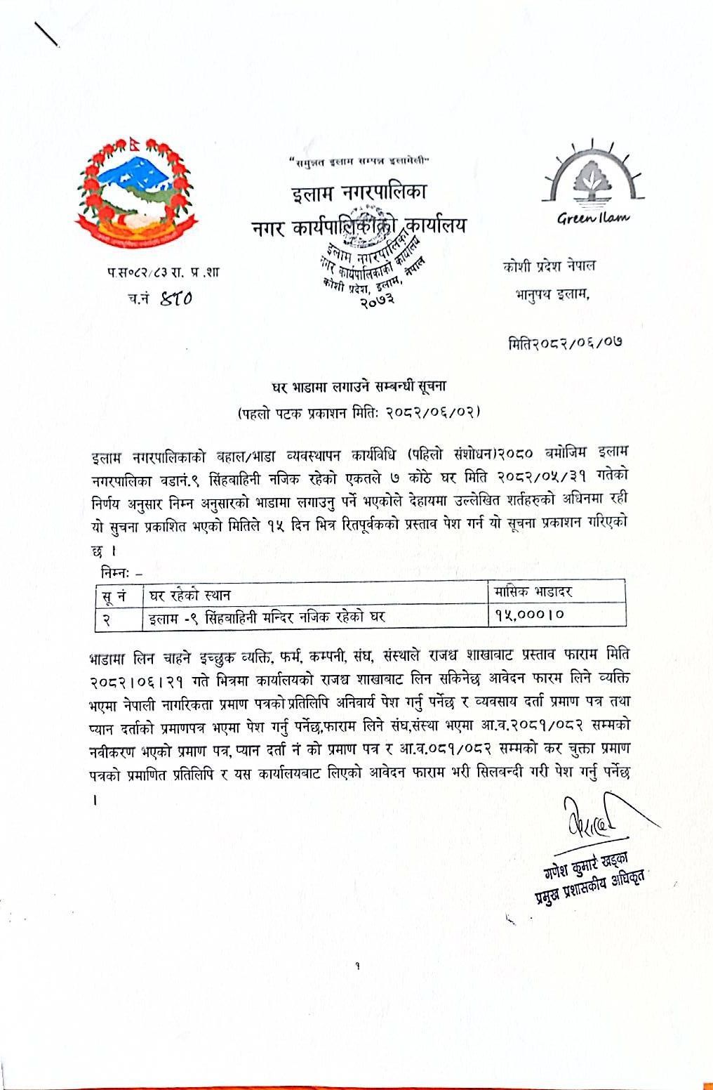 Home » घर भाडामा लगाउने सम्बन्धी सूचना ।